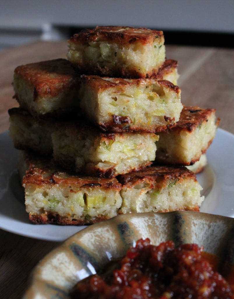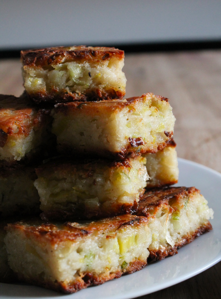 One evening whilst mindlessly scrolling the internet at 2am I came across Pailin from Pailins Kitchen making gui chai tod, a Thai chive dumpling made with rice flour. Unlike most Thai food gui chai tod is rather plain. You make the mix, steam it, slice into bite sized pieces and then fry it, to give it a crispy coating. It immediately struck me how similar it was to leek pudding and how the thing missing from leek pudding was texture (and perhaps in my grandmas case also flavour). It seemed a fitting remedy to my grandmas version, as although she wasn’t much of a cook, the woman knew how to fry food.